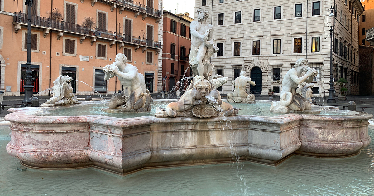 In the center of the Fontana del Moro stands a robust, naked man — the eponymous “Moor,” which was a later addition by Bernini to the original design. He is perched on a conch shell and is wrestling with a dolphin. The main figure is surrounded by four kneeling Tritons, messenger sea gods doing various things like blowing into elaborate seashells. All are suspended in a large basin of rose-colored marble. In September 2011 this majestic fountain and the Trevi Fountain, certainly Rome’s best-known fountain, sustained damage when they were attacked by a vandal with a hammer.