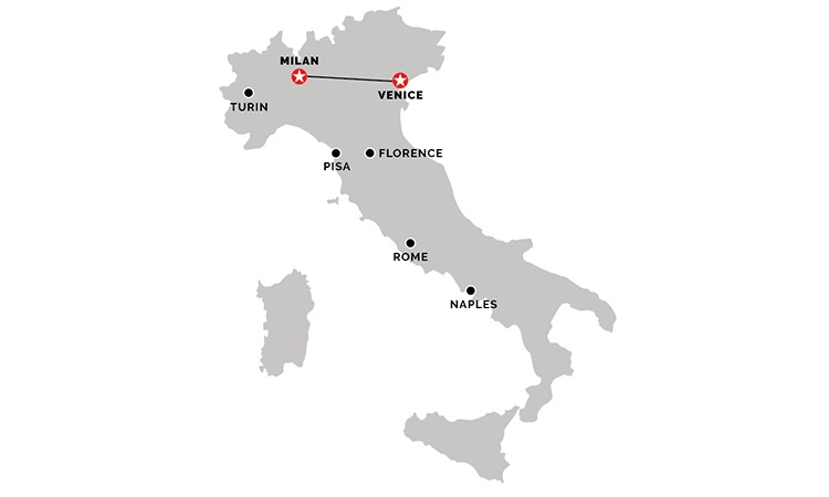 Get ready to shift gears as you make the easy and comfortable journey from bustling Milan to the tranquil canals of Italy’s floating city. Many of Italy’s high-speed trains make the 153-mile journey in just 2 hours and 25 minutes.