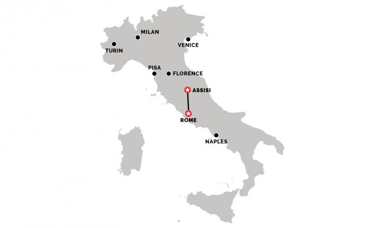 Rome and Assisi are 174 miles (108 km) apart by train, and though it takes roughly the same amount of time to drive this distance, getting out of Rome by car can be stressful. Opt for the train for a stress-free departure from Rome and a relaxing trip through Italy’s “green heart”, where the landscape is lush and mountainous. Try to get a seat on the right side of the train to enjoy the view of the Umbrian Valley’s picturesque hilltowns leading up to Assisi.