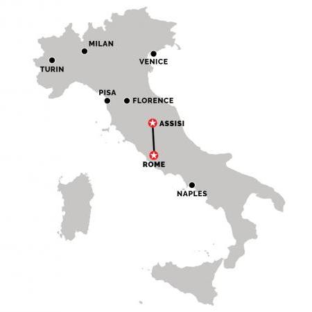 Assisi, one of the most visited hilltowns in Italy, is the birthplace of Saint Francis and home to the Basilica of Saint Francis, a UNESCO World Heritage Site famous for its Giotto fresco cycle. A tiny town on the slopes of Mount Subasio, Assisi is an easy train trip from Rome.