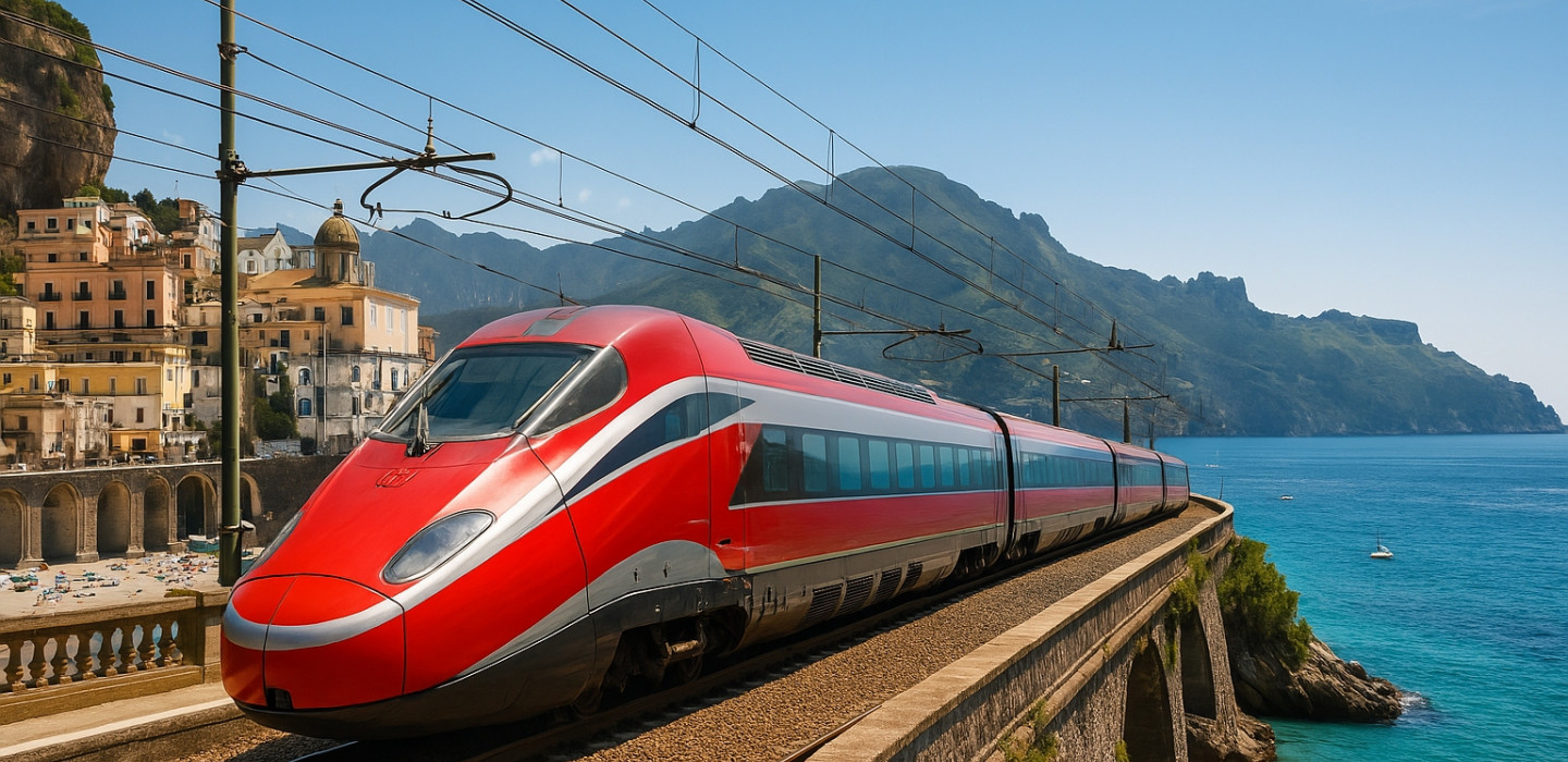 Once sleepy fishing hamlets, the towns along the Amalfi Coast are now magnets for international travelers — and with that popularity comes gridlock. Thankfully, there’s a better way to explore this stunning stretch of coastline. Our journey begins in Rome, where you’ll hop aboard a high-speed train that zips you down to Salerno in style — complete with legroom, onboard refreshments, and Wi-Fi.